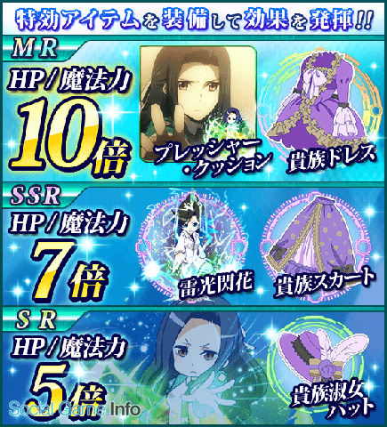 イベント連動の「お嬢様ガチャ」に、七草真由美のMR魔法式「プレッシャー・クッション」やコスチューム「貴族シリーズ」が新規投入された。今回追加された新規アイテムは、同じレアリティ内での出現率が「30倍」にアップしており、単発ガチャは1日1回限定「80MC」で引くことができる。10連ガチャはMR出現率が3倍、SSR以上のアイテムが1個以上確実に手に入るとてもお得なものになっている。また、今回追加されたアイテムは開催中イベントの特効アイテムになっているため、パーティーメンバーが装備するとステータスが上昇する。「プレッシャー・クッション」や「貴族ドレス」はHP、魔法力が10倍上昇するので、装備して敵を一気に蹴散らそう!