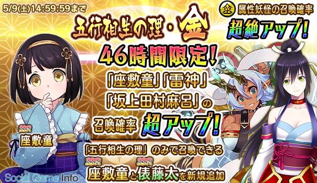 5/7(木)メンテナンス明けより、日替わりで属性ごとの妖怪の召喚率が超絶アップ&人気SSR妖怪の召喚率が超アップする「五行相生の理」を開催! 今回より「五行相生の理」の期間のみ「SSR座敷童」と「SSR俵藤太」を限定追加! 10連レア召喚は最後の1体は「五行相生の理」各属性の大妖怪(SR以上)確定!