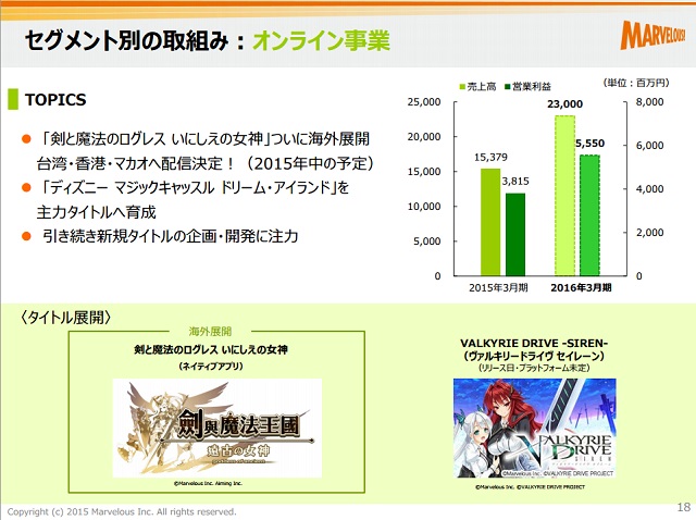 マーベラス<8744>は、5月12日、2015年3月期の決算説明会資料を公開し、Aiming<3911>との共同事業で展開中の『剣と魔法のログレス いにしえの女神』について、2015年中に台湾・香港・マカオで配信することを明らかにした。