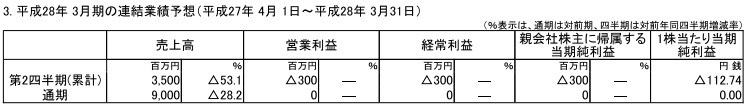 2016年3月期通期の予想は、売上高は90億円(前期比28.2%減)、営業利益、経常利益、当期純利益はそれぞれゼロとなる見通し。