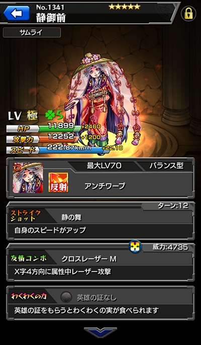 ガチャ「レディー・ガチャ」で排出される、源平シリーズの新キャラ「静御前」は全て(HP/攻撃力/スピード)の「+値」がMAX値(進化前)で排出!「鞍馬天狗」はHPと攻撃力の「+値」が+50、スピードの「+値」が+1.70で排出されます!