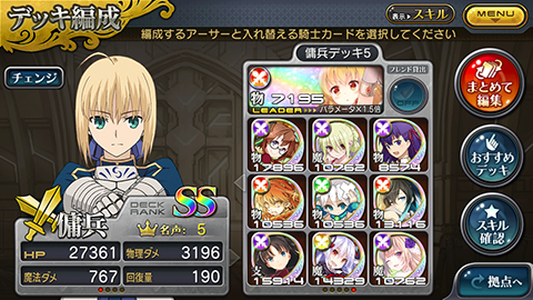 3.セイバー入手後は、デッキ編成画面の「チェンジ」ボタンをタップすることで、既存のアーサーか、セイバーかを選択することができる。