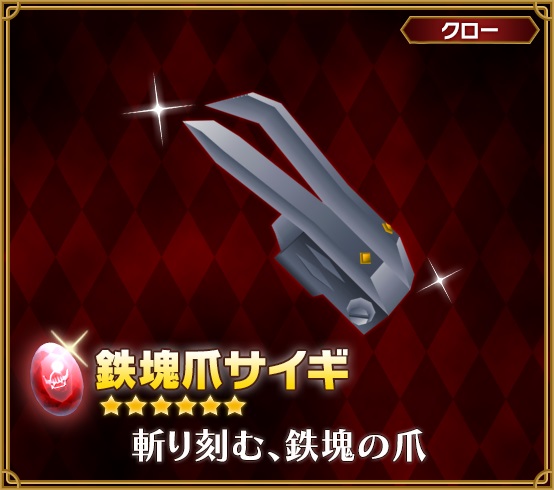 的中確率超絶UP!×3倍の対象となるのは、アックスの「鉄塊斧ゴウタン(★6)」、クローの「鉄塊爪サイギ(★6)」、ロッドの「鉄塊フンヌ(★6)」の3種。また、過去に登場した、ブレードの「鉄塊剣ムザン(★6)」をはじめとした4種も通常確率で再登場する。