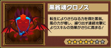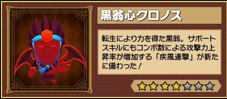 さらに、レアドロップとしてココロイド「ソウルオブクロノス(★3)」が手に入ることもある。コンボ数に応じて攻撃力を大幅にアップするスキルを持つ「ソウルオブクロノス(★3)」は、転生させると、「黒翁心クロノス(★4)」になり、さらに転生させることで「黒翁魂クロノス(★5)」になり、転生するごとにスキルの効果も上昇していく。