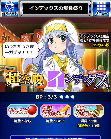 あなたは「インデックス」と「上条当麻」と一緒に屋台を回る予定だったが、後先を考えずに食べそうなインデックスを上条が注意するとインデックスは拗ねてしまい、上条を置いて二人で屋台を回ることに―。 インデックスの空腹を満たそう! オリジナルシナリオイベント「インデックスの爆食祭り」が期間限定で開催中!