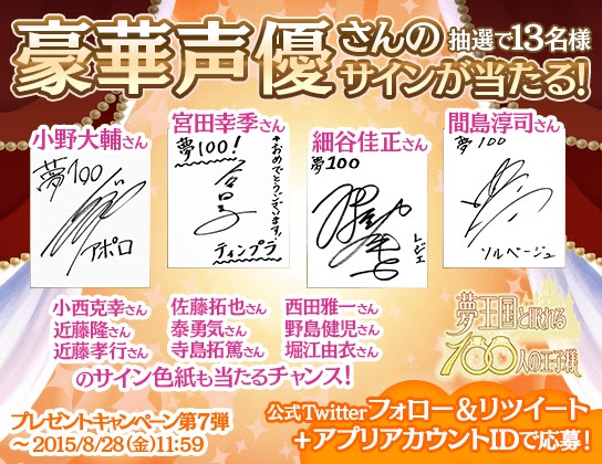 ジークレストは、女性向けスマホパズルRPG『夢王国と眠れる100人の王子様』公式サイトにて、この夏に登場した王子様で出演された声優陣13名のサインをプレゼントするキャンペーンを実施する。