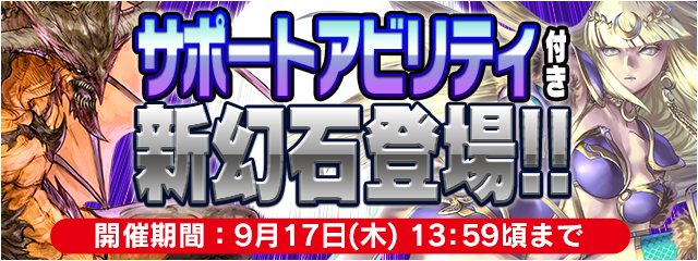 本日(9月10日)のアップデートにおいて、装備しているだけで効果のある「サポートアビリティ」を持つ幻石や、APを回復できる機能のほか、オートバトルの改良など各種追加と調整が行われた。さらに新アイテム「召喚券」をはじめとする各種アイテムのプレゼントを実施する。