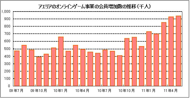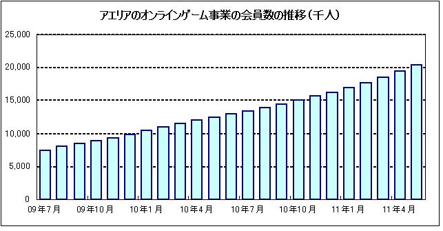 以下、アエリアのオンラインゲーム事業の売上高、会員数の状況をグラフにしたものを掲載する。売上高については、2010年11月頃から4億円台で安定的に推移していることが伺える。会員数の増加ペースについても右肩上がりとなっている。