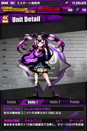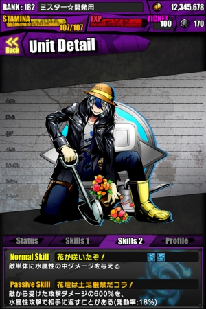「カゲロウ」が進化すると「味方の炎属性ユニットまたは機械族ユニットのHPが2.5倍、攻撃力が3.0倍になる」リーダースキル「フィアマシナライズ:アサルトシフトIII」と、「敵全体を攻撃力×50倍の炎属性で攻撃する。さらに、10ターンの間、敵全体の防御力を100%減らす」アクティブスキル「ギルティノヴァ」を持っております。
