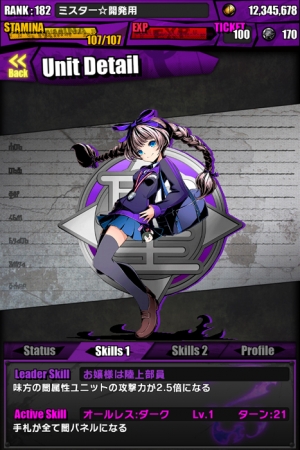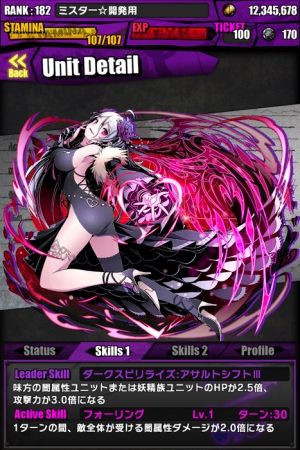 また「敵からダメージを受ける時、手札の闇パネル1枚につきダメージを12%減らし、そのパネルをランダムに交換する」パッシブスキル「インサルト」を持つ、超強力なユニットです。炎属性ユニットまたは機械族ユニットで構成したパーティーのリーダーで、大活躍できるでしょう。