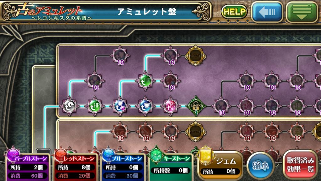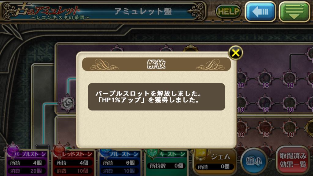 石をはめ込める穴のようなもの(スロット)が空いている盤面専用のアイテムを消費することで、スロットが解放され、騎士団戦に有効な効果が発動します。スロットはレッド・パープル・ブルーの3種類が存在し、それぞれ、レッド(殲滅役)・パープル(壁役)・ブルー(キャッスルブレイク役)に適した効果を持っています。スロット解放にはルートが存在し、1つのルートだけではなく、複数のルートを選択することも可能です。