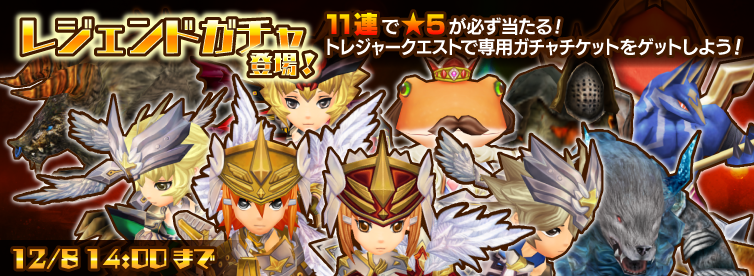 また、「レジェンドガチャ」では、10+1連ガチャを回すと、★5ガーディアンなどの★5が確定のキャンペーンを行っている。さらに「レジェンドガチャ」専用のガチャチケットも「トレジャークエスト」に登場している。こちらの期間も本日から12月8日14時まで。