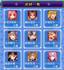 12月12日(土)~第1回『やらいでか姫総選挙』を開催いたします。ナンバーワンに選ばれた武将はLE武将として新規パラメータで復刻する。