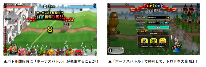 各キャラのトロフィーは、「トロP」を一定数貯めると獲得することができます。「トロP」を獲得するには、「キャラのLvが20以上」「うまP200以上」など各キャラによって条件が異なり、条件を満たした状態でバトルを行なうことで「トロP」を獲得できます。また、バトルを開始すると「ボーナスバトル」が発生することがあり、バトルの勝敗に関係なく、獲得トロPが2・3・5・10倍のうちいずれかの倍率で増加します。「ボーナスバトル」が発生したら、勝利してトロPの大量獲得を目指しましょう!