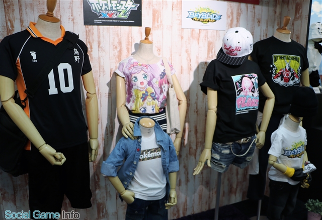 ▲アパラルグッズ。もともと子供用アパレルとして展開してきたが、最近では『ハイキュー!!』や『プリパラ』など大人向けのアパレルの取り扱いも始めているとのこと。