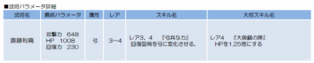 弓属性と騎馬属性の武将が多数登場するイベントエリア。クリアするとレア武将「斎藤利堯(弓★3~4)」がドロップします。「斎藤利堯」のスキルは弓属性の攻撃チャンスを増やすので、弓属性部隊に最適! 超難易度の天元では必ずドロップ!
