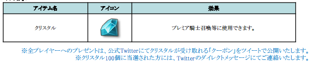 さらに、アップデートを記念して本日より、Twitterを利用したキャンペーンを実施する。公式Twitterの特定のツイートがリツイートされた数に応じて、全プレイヤーへ最大30個のクリスタルをプレゼントする。さらに公式Twitterをフォローし、リツイートしたユーザーから抽選でで5名にクリスタルを100個プレゼントする。