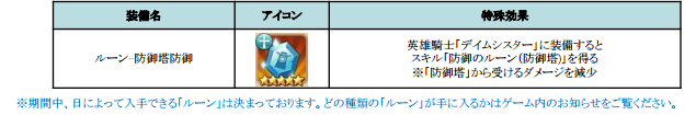 また、これにともない期間中、1日1度各種ダンジョンを1回プレイすることで、特定の「ルーン」を手に入れることができるキャンペーンを開催する。入手できる「ルーン」は「防御塔」などの施設へ与えるダメージの増加や、「防御塔」から受けるダメージを減少させる効果を持っており、英雄騎士に装備させればエリアバトル等で活躍させることができる。
