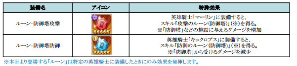 アップデートを記念し、本日より、新装備「ルーン」を入手できるキャンペーンを開催いたしました。期間中、1日1度ダンジョンをプレイすることで、特定の「ルーン」を手に入れることができます。入手できる「ルーン」は「防御塔」へ与えるダメージの増加や、「防御塔」から受けるダメージを減少させる効果を持っておりますので、英雄騎士に装備させればエリアバトルで活躍させることができます。