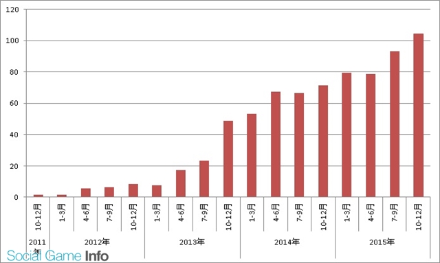 コロプラ<3668>は、本日(1月27日)、第1四半期(2015年10~12月期)の単独決算を発表し、売上高232億円(前年同期比41.5%増)、営業利益104億円(同46.1%増)、経常利益105億円(同45.3%増)、最終利益64億円(同50.2%増)だった。