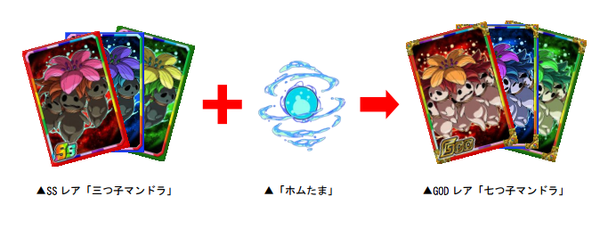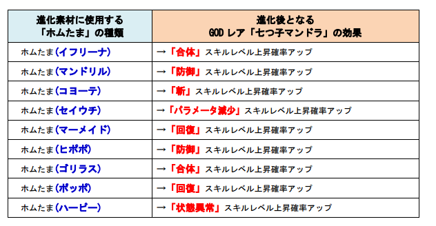 「錬金 P」を使い、素材ガチャを回すと、限定の強化素材「マンドラゴラ」を手に入れることができます。「マンドラゴラ」は、一部のモンスターに使うと強化値 2 倍の効果があります。また、今回より、SS レア「三つ子マンドラ」に「ホムたま」を使うことで、スキルレベル上昇確率をアップできる GOD レア「七つ子マンドラ」へと進化させることができます。「七つ子マンドラ」は、進化素材として使用した「ホムたま」の種類により、スキルレベル上昇確率がアップするスキルが変化します。