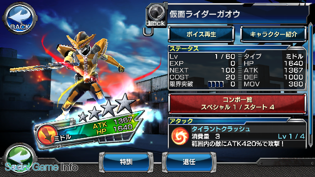 スキル①:「超ボイスターズキック」⇒範囲内の敵にATK480%で攻撃!自身のHP が一定以下の時800%で攻撃!