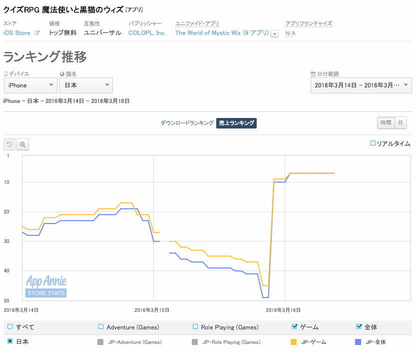 そんな中、コロプラ<3668>の『クイズRPG 魔法使いと黒猫のウィズ』が前日より38ランクアップの7位に付いている。こちらのタイトルでは、3月15日より、イベント「黄昏メアレス」を実施中だ。このイベントでは、SS以上「黄昏メアレス精霊」のみ登場するガチャを行っており、さらに「ウィズセレクション【祭】」として、クリスタルガチャにウィズセレクション限定精霊及び、一部の精霊が【SS】か【L】の状態で手に入ることから、これらの施策が功を奏し、順位を上げた模様だ。