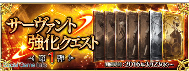 サーヴァントの能力が強化される特別なクエスト、「サーヴァント強化クエスト」が初登場する。その第1弾となる今回は、計7騎が対象になる。1日1騎分ずつ、7日連続で計7つのクエストが、カルデアゲートにて開放されていく。クエストクリア報酬として、対象サーヴァントの強化が行われるだけでなく、聖晶石も獲得できる。