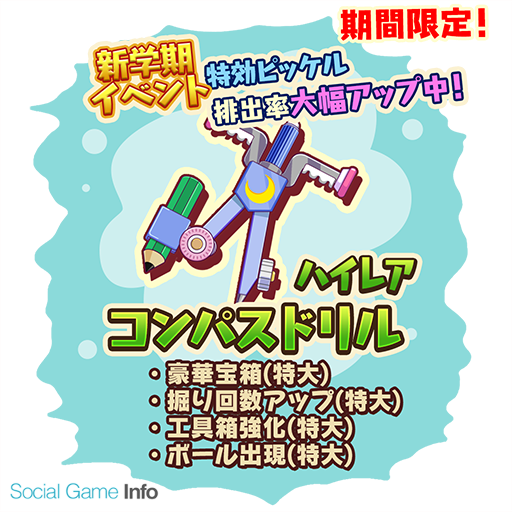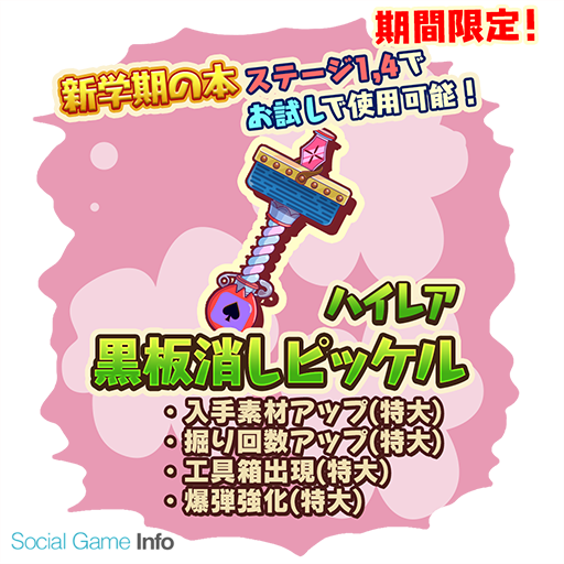 このイベント期間中は専用の特別な本が出現。新学期の本をプレイすることによって、このイベントでしか入手できないスクールモチーフの可愛い家具を作るための素材をゲットできる。今回のイベントステージのギミックには「ボール」が登場。ボール強化やボール出現のスキルを持ったピッケルはきっと攻略に役立つはずだ。もちろん、今回も期間限定イベントの本の攻略に役立つスクールモチーフのピッケルが黄金の釜に登場する。イベント攻略に役立つ性能を持つピッケルを手に入れて、限定家具をコンプリートしよう!