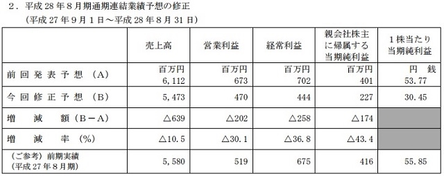 ■トーセ、16年8月期の営業益予想を下方修正、6.73億円→4.70億円…遊技機の受注低迷やスマホ大型タイトルでの損失計上、東南アジアでの事業展開の遅れで