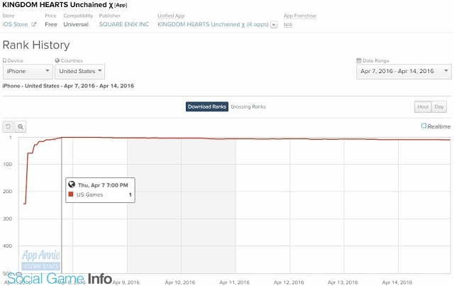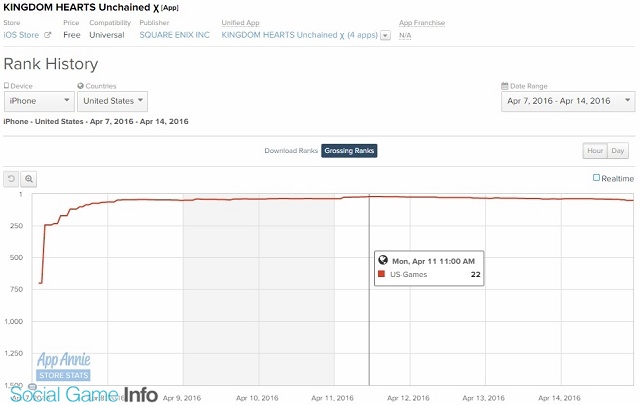 スクウェア・エニックスが4月7日より北米でリリースした『KINGDOM HEARTS Unchainedχ』が好調なスタートを切ったようだ。リリース当日に無料ランキングで首位を獲得し、その後、売上ランキングでも4月11日(現地時間)には一時、22位まで順位を上げる場面もあった(ゲームカテゴリー)。