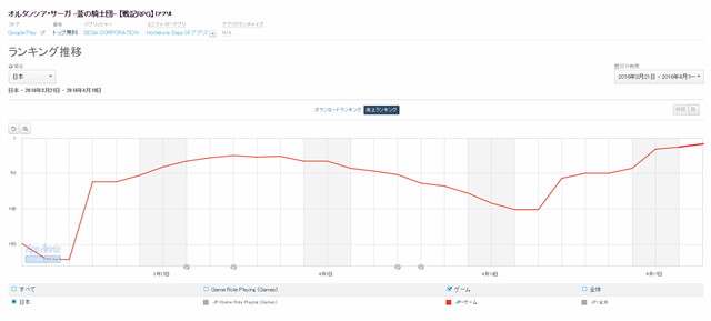 そんな中、昨日も取り上げたセガゲームス セガネットワークス カンパニーの『オルタンシア・サーガ -蒼の騎士団-』が引き続き好調で、3ランクアップして10位となり、トップ10圏内にランクインしている。自分の選択した各属性2種類、計8種類のSSRユニットに限定して引くことができる「選べるエイトガチャ」が人気なほか、4月18日からは、最大15枚のプレミアムチケットを獲得できる「一周年予告クエスト」を開催しており、ユーザーの注目を集めているようだ。