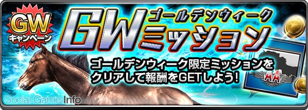 前半(期間:2016年4月28日(木)15:00~5月2日(月)23:59まで)と、後半(期間:2016年5月3日(火)0:00~5月8日(日)23:59まで)でミッション内容が変わりますので、ぜひ、有力種牡馬を獲得し、温泉、ハチミツなどで愛馬の育成にお役立てください。