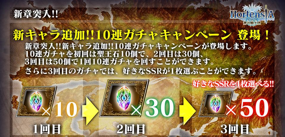 内容:通常 1 回あたり聖王石 50 個が必要な“10 連ガチャ”を、初回は聖王石 10 個で、2 回目は30 個、3 回目は 50 個で 1 回、回すことができます。さらに 3 回目のガチャでは、好きなSSR を 1 枚選ぶことができます。