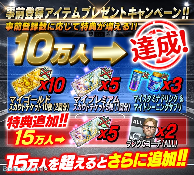また、 事前登録の目標数に新たに「15万人」を追加し、 これを達成すると、 特典に「マイプレミアムスカウトチケット」×5、 「ランクCコーチ(ALL)」×2をプレゼントします。