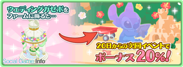 さらにGETした「ウェディングガゼボ」をファームに飾れば20日からの次回イベントで ボーナスがなんと+20%アップ! 次回のイベントは、いたずら好きのあの人気者が登場!?ぜひ GET してイベントを有利に すすめよう♪