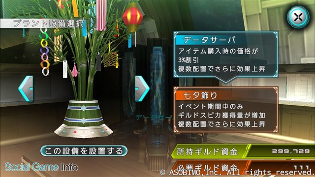 ギルドのレベルアップに役立つイベント限定プラント設備「七夕飾り」が登場します。ギルドメンバーの憩いの場「プラント」に設置でき、ギルドのレベルアップに必要な経験値の獲得量がアップします。他の設備よりも少ない資金で設置できるので、ギルドレベルが低く、できたばかりのギルドでも設置可能です。