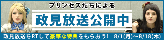 『タワー オブ プリンセス』公式 Twitter アカウントより投稿されたプリンセスたちの政見放送をリツイートして、豪華なゲーム内アイテムをもらおう!8 人のプリンセスの「政見放送」動画を見て、面白いと思った投稿をリツイートしてください。期間終了時の各政見放送のリツイート数に応じて、プリンセスに帰属するプレイヤーの皆様に豪華景品をプレゼントいたします。
