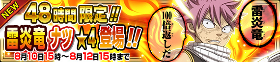 さらに、8月10日からはこちらも48時間限定で『【雷炎竜】ナツ』が登場する48時間限定ガチャキャンペーンを実施します。ゼレフに続きこのチャンスに限定魔導士を獲得し強力な魔法も獲得しましょう!!