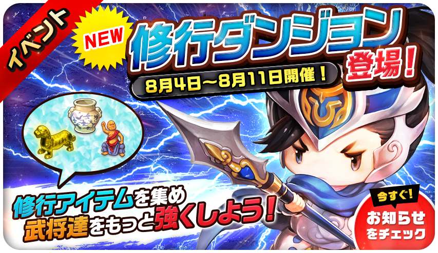 修行アイテムが入手できる『修行ダンジョン』が追加されました。 手に入れた修行アイテムで統率や武勇、智謀を上げて武将達を強化しましょう!