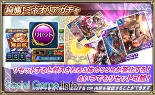 “絢爛!ミネオリアガチャ”は、「ミネット勲章」、もしくは「聖王石」で挑戦することができ、1回挑戦するごとに、ランダムでセットされた60体のユニットの中から1体ずつ獲得できる。ガチャの中には、「ヴェロニク」を含む4体のSSRユニットが必ず封入されており、60回挑戦することで、全てのユニットを入手することができる。また、ガチャを10回連続で利用するごとに貴重な「騎士の記憶」を獲得することもできる。