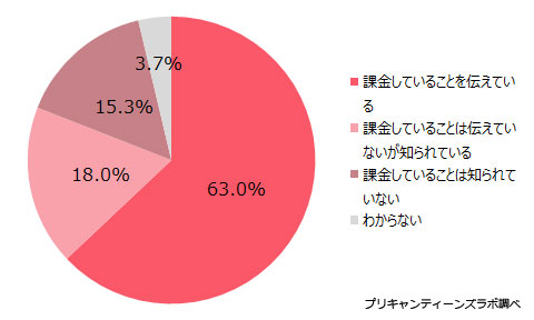 アプリに課金をしている子に「課金に関して保護者に伝えているか」を尋ねたところ、「課金していることを伝えている(63.0%)」、「課金していることは伝えていないが知られている(18.0%)」が合わせて8割以上にのぼり、保護者の多くがスマホアプリの課金について把握していることがわかりました。このことから、10代女子が課金に対して慎重であることがうかがえます。