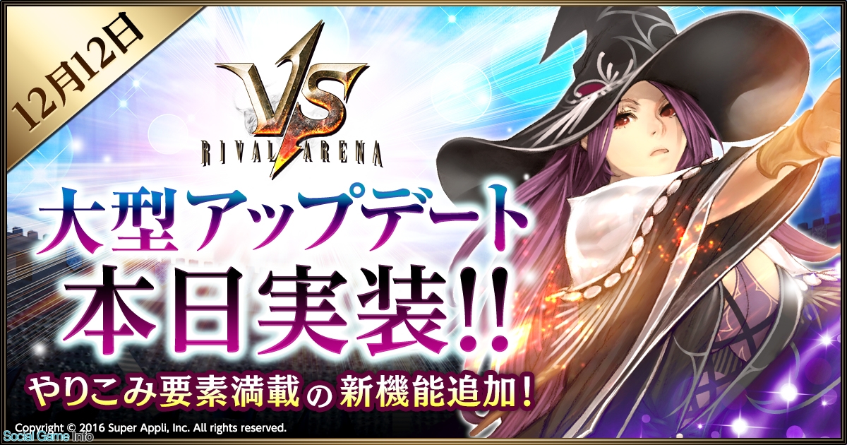 スーパーアプリは、同時ターン制対陣バトル『ライバルアリーナVS』において、本日12月12日に、大型アップデートを実装し、新クリーチャーの詳細を発表した。また、大型アップデートを記念してリツイートキャンペーンを実施している。