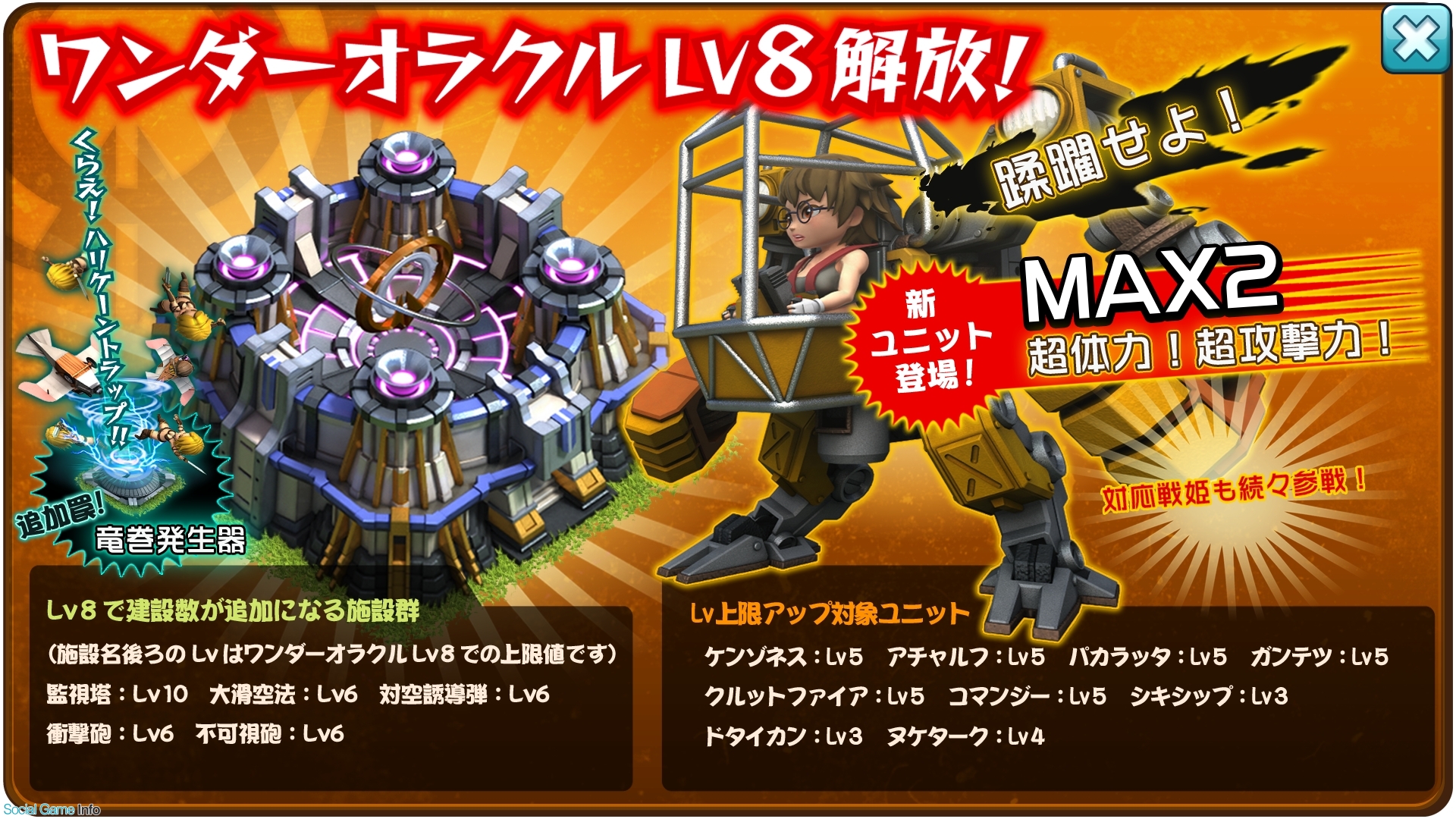 “ワンダーオラクル”の上限Lvが引き上げられることによる、Lv8でしか使用できない超強力なユニット「MAX2」が追加されます。また建設できる施設数が増えるほか、ユニットと施設の最高レベルも引き上げられます。自国をますます強化し、戦闘力を上げることが可能になります。