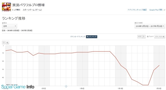 この日のランキングで順位の上昇が目立ったのは、前週末の49位から25位に上昇したコナミデジタルエンタテインメントの『実況パワフルプロ野球』だ。『パワプロ』は、1月19日のメンテナンス後より、「ヒキョリくん!~東北編~ 開催記念ガチャ」を開催しており、売り上げを伸ばしているもよう。