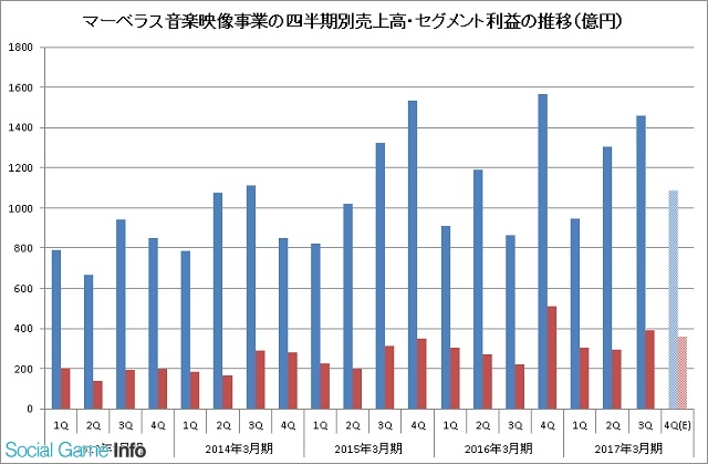 マーベラス<7844>の音楽映像事業が引き続き好調だ。第3四半期累計(2016年4~12月)の業績をみると、売上高が前年同期比で25.2%増の37億0900万円、セグメント利益が24.2%増の9億9000万円となり、過去最高記録を更新した。第3四半期(10~12月)だけでみても、売上高が14億6000万円、セグメント利益が3億9100万円となり、いずれも第3四半期としては過去最高の水準となった。四半期ごとに変動は見られるが、セグメント赤字を出すことはなく、安定した収益成長でマーベラスを支える事業に育った。総合エンターテイメント企業であるマーベラスの強みがみえる。