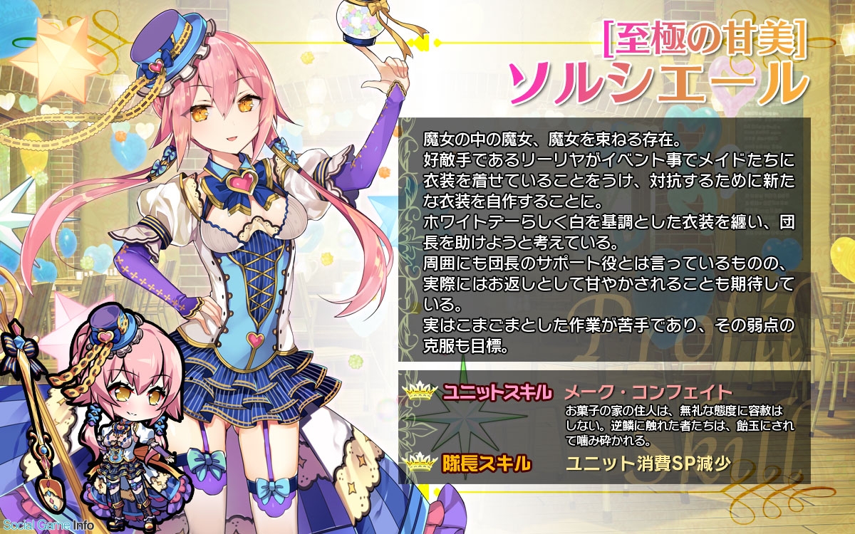 ランクR以上のユニットが必ず獲得できる「限定募集」にて、ホワイトデーの特別衣装の「[至極の甘美]ソルシエール」「 [甘い恋の依頼]ルラフィス」が登場!