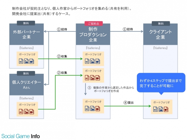 これまでのポートフォリオに関わる運用は、提出元と受取手の双方に大きな負担が掛かっていた。提出元である制作会社・個人クリエイターは、作品選定やポートフォリオ作成、提出に大きな労力を費やし、ポートフォリオの受取手である企業も、提出様式が統一されていないことによって、閲覧や管理、検索などに多大な時間が掛かっていた。「Galleries」は、ポートフォリオの運用業務からこれらの負担を取り除き、より効率的な業務環境を実現する。
