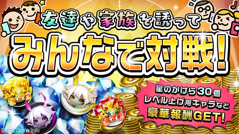 「オセロニアンみんなで対戦キャンペーン」を 開催します。本キャンペーンは、ゲーム内の 「友達と」対戦バトルを行うことで獲得できる pt(ポイント)に応じて、最大で「星のかけ ら」30個や「各属性のフェアリー」など、豪華 な報酬を入手することができます。