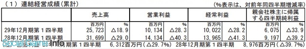 ガンホー・オンライン・エンターテイメント<3765>は、本日(4月28日)、第1四半期(17年1~3月)の連結決算を発表し、売上高257億円(前年同期比18.9%減)、営業利益101億円(同28.3%減)、経常利益100億円(同28.2%減)、最終利益60億円(同33.9%減)となり、減収減益だった。